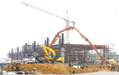 本報訊 昨天下午,高鐵蚌埠站工人們正冒雨進行施工。目前,高鐵蚌埠站地下通道部分主體完成,進入地面一層施工階段。