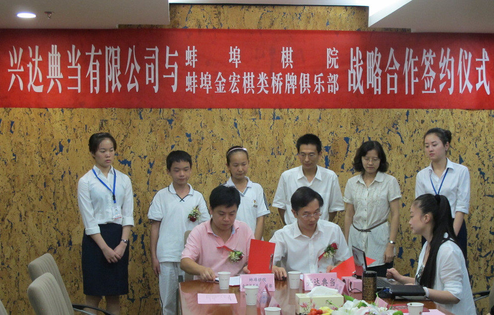 914,興達(dá)典當(dāng)有限公司與蚌埠棋院社、金宏棋類橋牌俱樂部簽訂合作協(xié)議。體育局副局長周青山、興達(dá)典當(dāng)總經(jīng)理陳孝凱及蚌埠棋院負(fù)責(zé)人等出席簽字儀式。