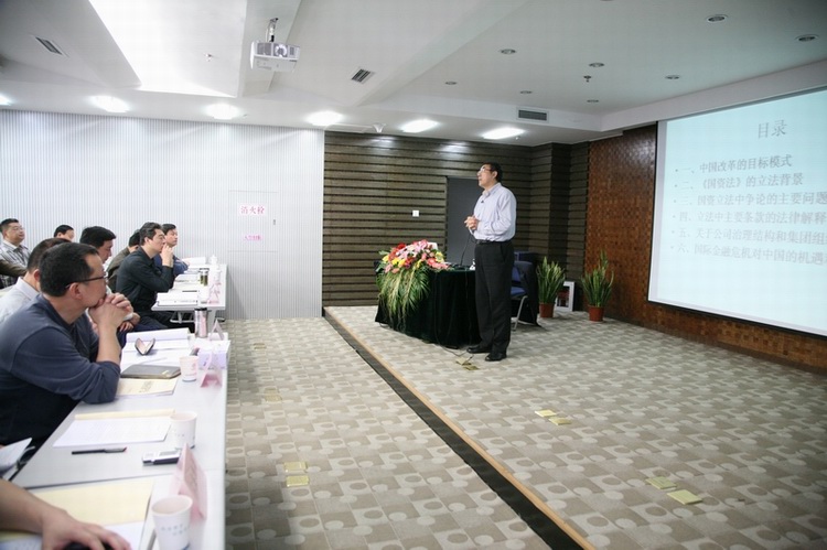 劉紀(jì)鵬教授對中國改革的目標(biāo)模式、國資改革中的政府定位、《國有企業(yè)資產(chǎn)法》的立法背景、立法中爭論的主要問題、主要條款的法律解釋等問題做了深入的講解,并對參會人員提出的疑問做了認(rèn)真的解答。此外,他還就國際金融危機(jī)對中國發(fā)展的機(jī)遇和挑戰(zhàn)提出了自己的獨(dú)到見解。